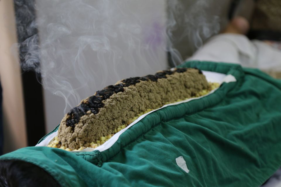 在生姜上放置5cm厚黄金艾绒,用火点燃,根据患者反应及时取走热烫处艾绒,待艾绒全部取后,再放5cm厚黄金艾绒点燃,如此反复3次,使之热量直达督脉及足太阳膀胱经穴位,以灸后皮肤潮红为度。